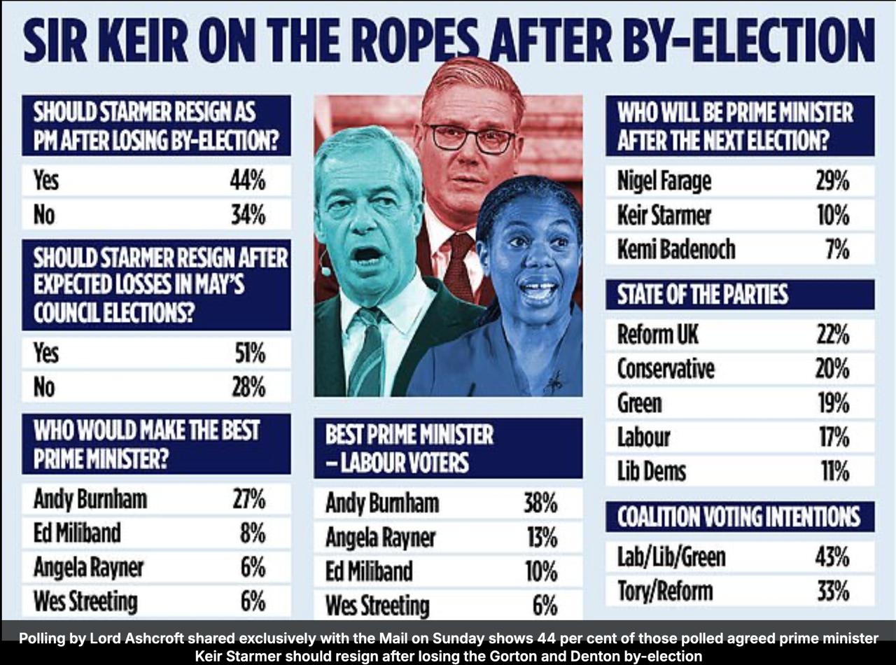 Свежий опрос, проведенный по горячим следам после позорного унижения лейбористов в Манчестере: 44% британцев считают, что Стармер после этого разгрома должен уже сейчас уйти в отставку (против - 38%). А если он так же проиграет майские муниципальные выборы, его отставки будет уже требовать 51% британцев (против - 28%).