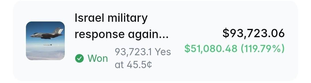 Один кошелёк превратил около 61 тыс. долларов в 493 тыс., второй — 30 тыс. в 120 тыс. Совокупный выигрыш шести аккаунтов составил около 1,2 млн долларов. Отдельный кошелёк под ником Curseaaaaaaa заработал ещё около 757 тыс. долларов на рынке «Хаменеи покинет пост до 31 марта» — поставив на «Да» ещё до объявления о гибели верховного лидера.