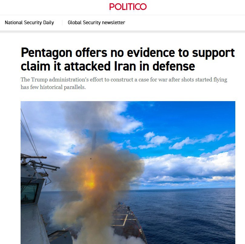 Politico сообщает, что 'Пентагон не предоставил убедительных доказательств того, что США напали на Иран из-за соображений собственной безопасности. Заместитель председателя комитета по разведке Сената Марк Уорнер (демократ от штата Вирджиния), который был в числе руководителей комитета, проинформированных высокопоставленными чиновниками, заявил, что он не видел никаких разведывательных данных, ‘свидетельствующих о том, что Иран находится на грани нанесения какого-либо превентивного удара по Соединенным Штатам Америки’. По его словам, президент ‘начал войну по собственному желанию’.