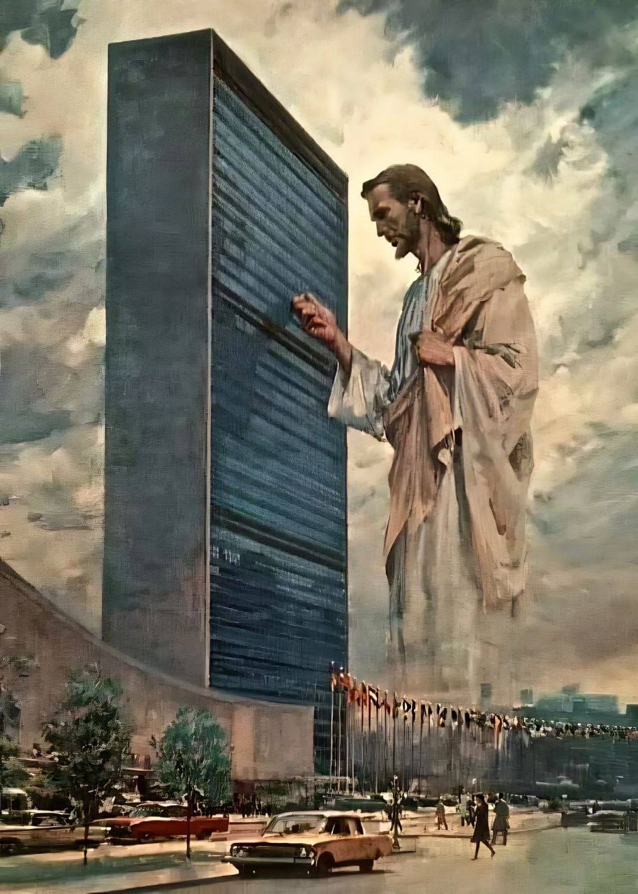 Работа знаменитого американского иллюстратора Гарри Андерсона, созданная во времена холодной войны 1961–1962 годах. Ее официальное название — «Принц мира» (Prince of Peace), хотя в сети она больше известна как «Иисус стучит в окна ООН».