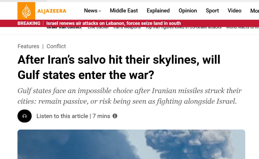 Эти высказывания, уточняет Аль Джазира, отражают распространенное в странах Персидского залива мнение о том, что это не их война. Фейсал Аль-Мудака, главный редактор газеты Gulf Times, выходящей в Дохе, прямо заявил: «Это война Израиля и США, и нас она не касается. Мы просто застряли в этом геополитическом положении».