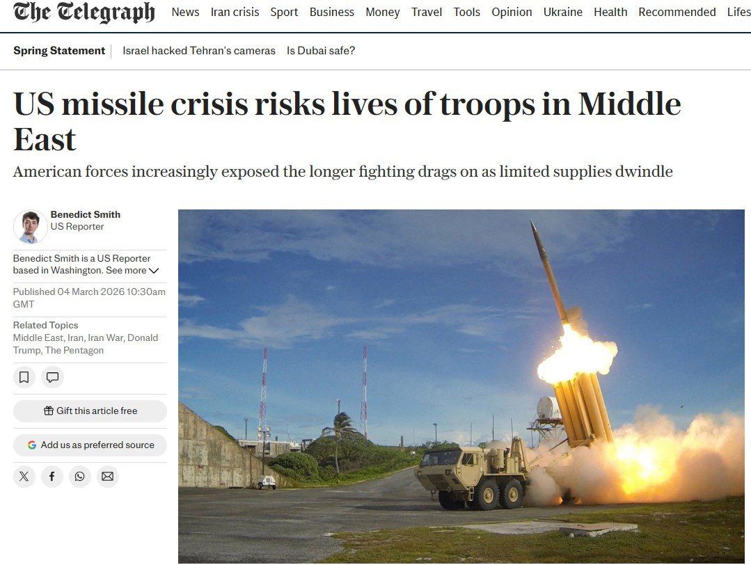 ‘Ракетный кризис в США ставит под угрозу жизни военнослужащих на Ближнем Востоке’ – The Telegraph пишет, что запасы ракет ПВО вовсе не бесконечные, как заявлял Трамп.