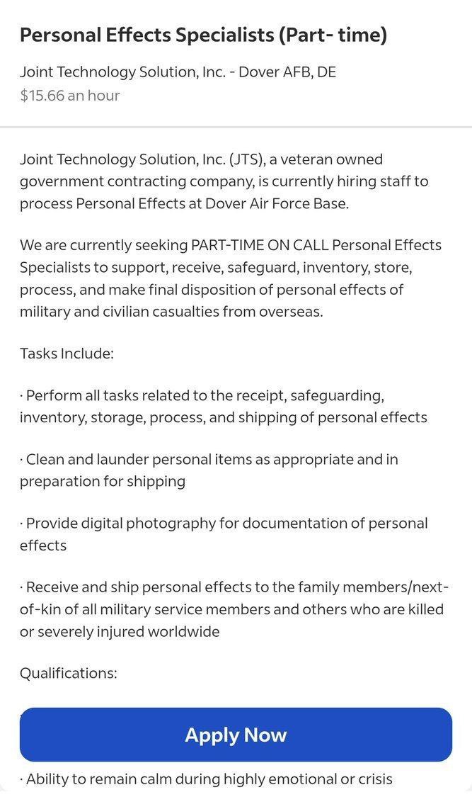 Как интересно. Подрядчик правительства США, компания Joint Technology Solution, нанимает "специалистов по личным вещам" на авиабазе Довер для обработки вещей американских военнослужащих и гражданского персонала, погибших или получивших серьезные ранения за рубежом.