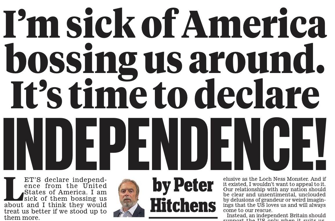 Ветеран британской журналистики Питер Хитченс сегодня на страницах Daily Mail призывает: «Мне противно, что Америка командует нами. Пришло время объявить независимость!»