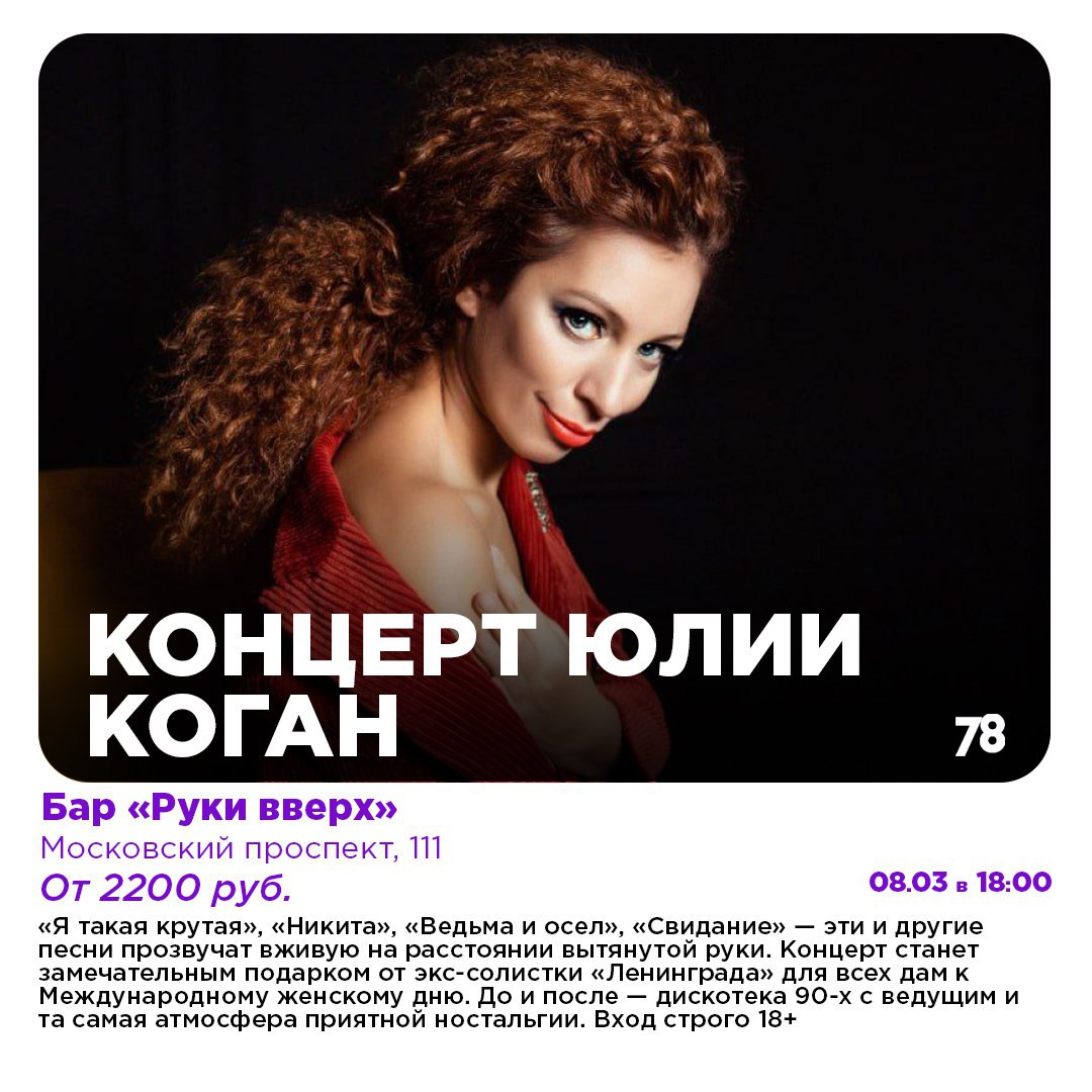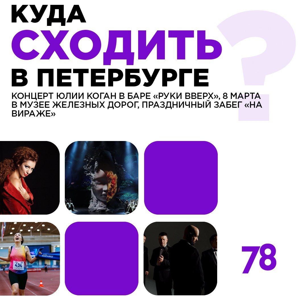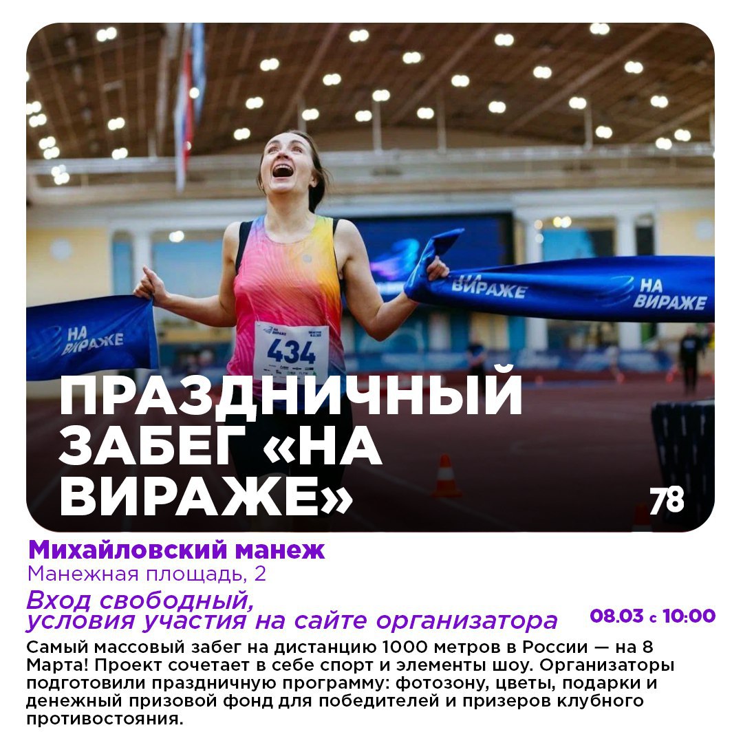 Активным дамам предлагаем провести Женский день в движении на массовом забеге в Михайловском манеже. Любознательным девушкам же определённо стоит окунуться в атмосферу джаза и исторической моды в Музее железных дорог. А вечером зажигаем под хиты Юлии Коган в баре «Руки вверх»!