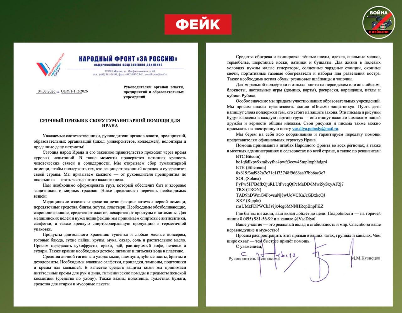 Фейк: Общероссийский народный фронт объявил сбор гуманитарной помощи Ирану. Соответствующее письмо распространяется в предложки соцсетей.