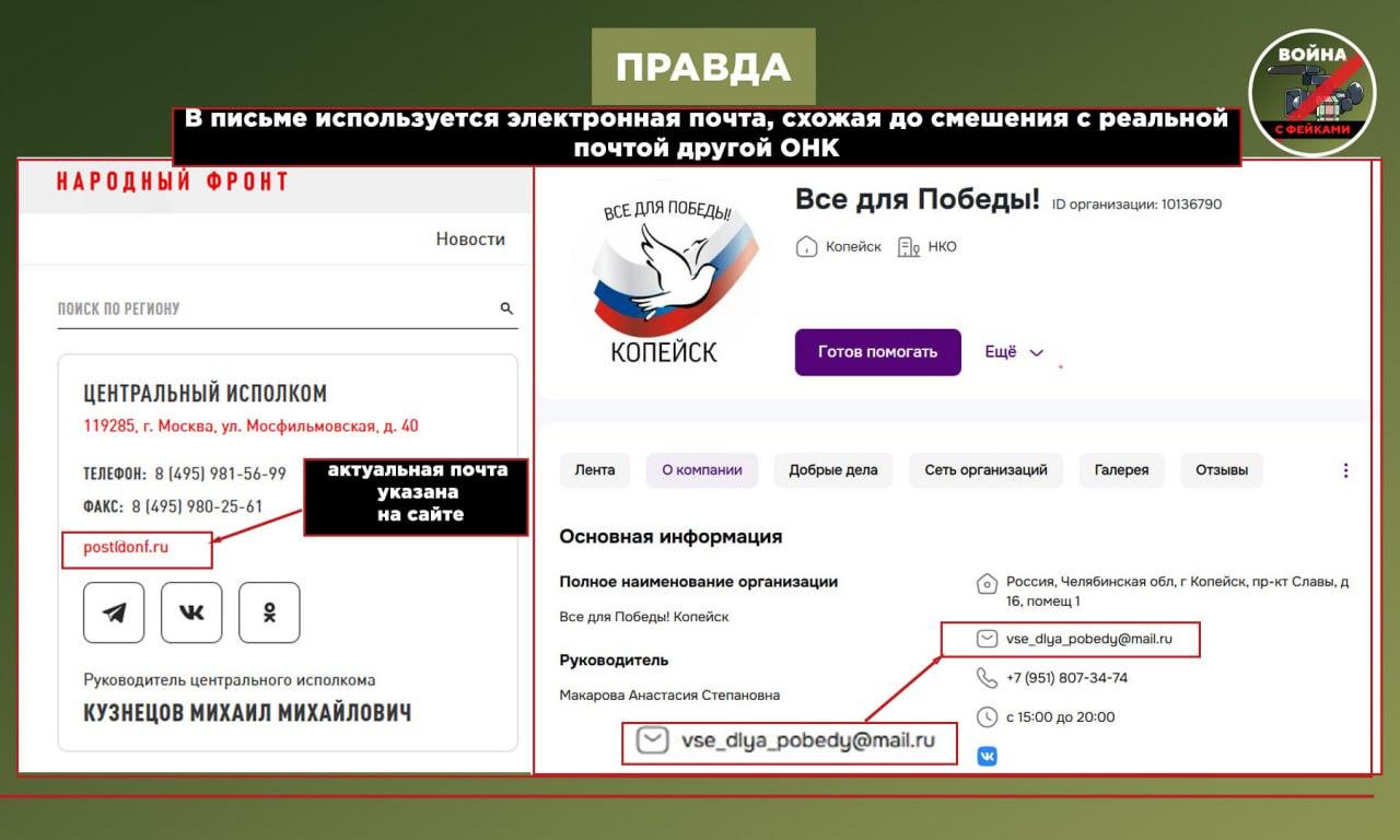 в письме используется электронная почта, схожая с реальной почтой другой организации — ОНК;