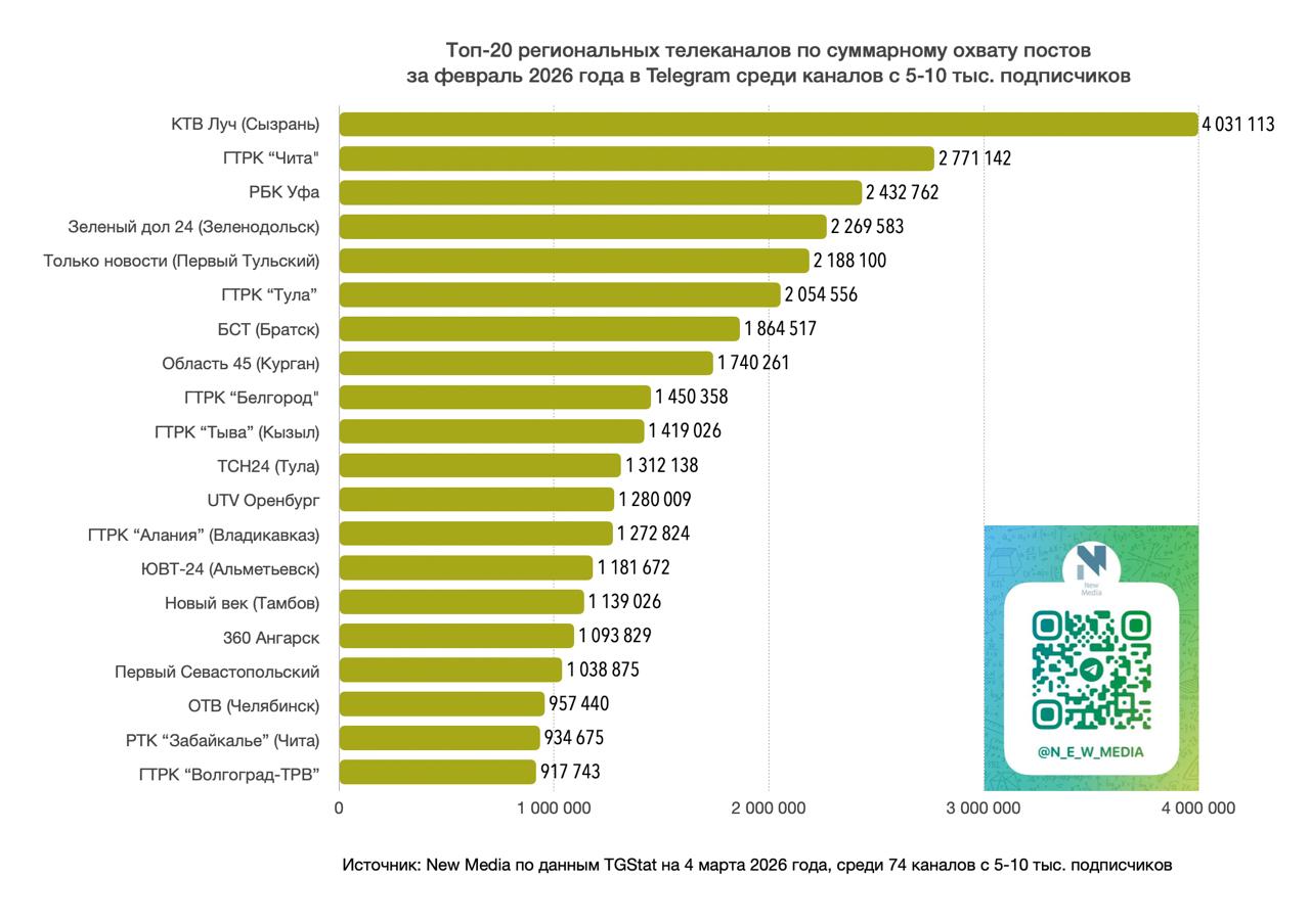 Источник: New Media по данным TGStat на 4 марта 2026 года, среди 74 тг-каналов с 5-10 тыс. подписчиков
