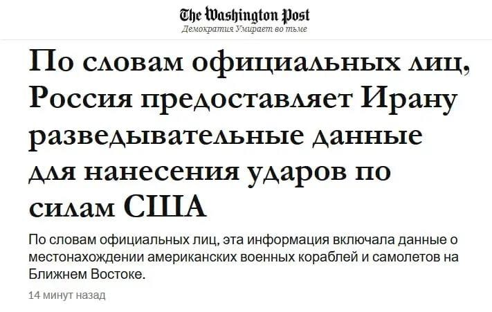 В Белом доме лёгкий приступ когнитивного диссонанса. The Washington Post, ссылаясь на "анонимные источники", которые из скромности не назвали свои ведомства, сообщает шокирующую новость: Россия делится с Ираном разведданными о местонахождении американских кораблей и самолётов, чтобы ему было удобнее их атаковать. Ой, оказывается так нельзя было.