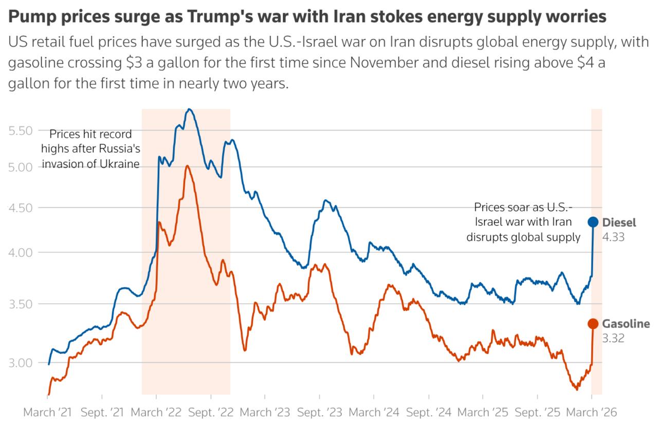 Но эффект на себе почувствовали и республиканские штаты. Рекордными темпами растут цены на бензин и дизель в Джорджии, Индиане, Западной Вирджинии. Ничего хорошего это республиканцам на скорых выборах в Конгресс не принесёт. Они всё отлично понимают, поэтому сейчас мы наблюдаем невиданное количество отставок законодателей в обеих палатах.