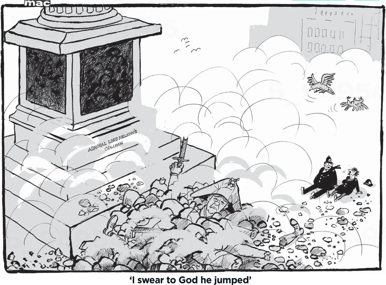 «Клянусь Богом, он прыгнул». Mail on Sunday полагает, что адмирал Нельсон на Трафальгарской площади в Лондоне не выдержит позора, который переживает нынешний британский флот, и спрыгнет со своей колонны.