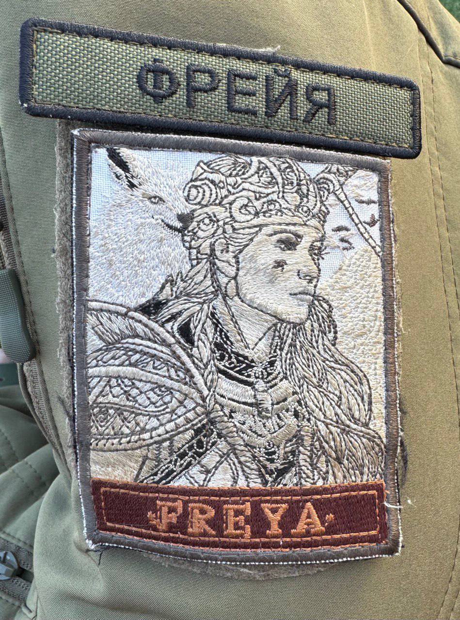 А это именной шеврон Ларисы Лукиной – реальной «Фрейи», которая сегодня руководит добровольческим отрядом «ОПЛОТ» (Объединение патриотов Ленинградской области и Санкт-Петербурга).