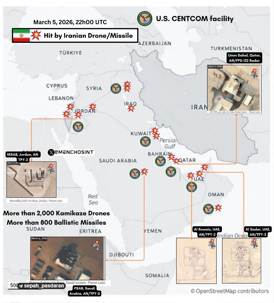 Опубликована карта объектов США на Ближнем Востоке, которые были поражены в ходе ответных ударов Ирана. Информация подтверждается спутниковыми снимками, данными из открытых источников и заявлениями официальных лиц.