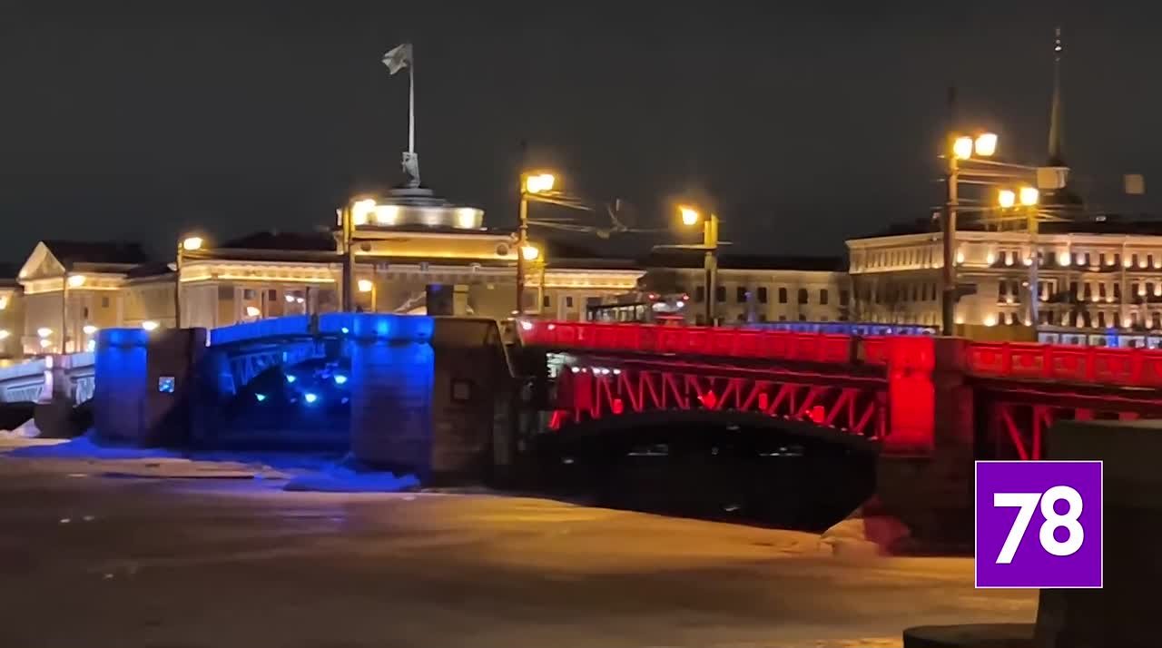 Дворцовый, Троицкий и мост Бетанкура окрасились в цвета российского флага. Особый режим освещения включили в 18:50, он будет работать до 7:30 9 марта.