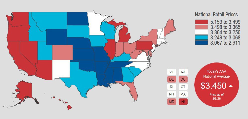 Всего за неделю средние цены на бензин в США выросли на 34 цента за галлон. Ещё 3 марта средняя цена (на бензин Regular — аналог нашего 92-го) составляла $3.109 за галлон, теперь $3.450. Хуже того, цена на Среднем Западе, в Пенсильвании, Мичигане, Огайо и далее теперь находится на уровне примерно $3.5 доллара за галлон, а это на 45-50 центов выше, чем неделю назад.