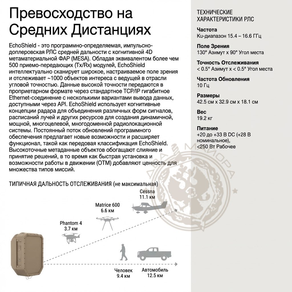 Речь идет о радарах с электронным сканированием, предназначенных для противодействия беспилотникам. Среди преимуществ можно назвать сопровождение небольших и низколетящих целей.