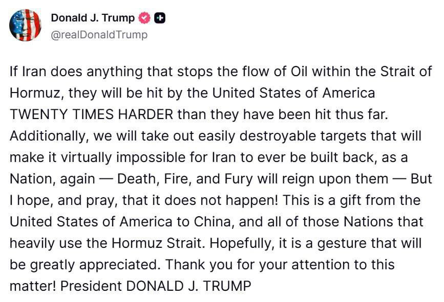 «Если Иран предпримет что-либо, что остановит поток нефти в Ормузском проливе, Соединённые Штаты Америки нанесут ему удар в двадцать раз сильнее, чем до сих пор. Кроме того, мы уничтожим легко разрушаемые цели, что сделает практически невозможным восстановление Ирана как нации — Смерть, Огонь и Ярость воцарятся над ними. Но я надеюсь и молюсь, чтобы этого не произошло! Это подарок от Соединенных Штатов Америки Китаю и всем тем странам, которые активно используют Ормузский пролив. Надеюсь, этот жест будет высоко оценен»,