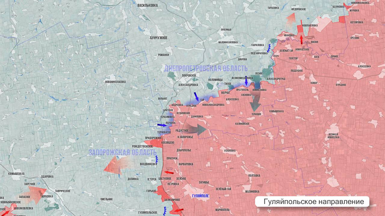 На Гуляйпольском участке ВС РФ широким фронтом продвигаются по рубежу Гуляйпольское-Верхняя Терса-Воздвижевка-Зарницкое, а также по дороге на северо-западе от Новопавловки. Украинские источники заявляют о восстановлении контроля над Днепропетровской обл на основании старого видео прорыва ВСУ к Новогригоровке. Однако у российской стороны есть данные объективного контроля, где зафиксирован плачевный для ВСУ итог этого прорыва – техника и рассредоточившаяся пехота уничтожаются «Ланцетами». По последним данным, противник не наступал на этом участке, проводил усиление и ротацию личного состава. Наши бойцы продолжают искать «подвальных сидельцев». Одного из таких нашли в Вербовом, где украинский штурмовик прятался с февраля.