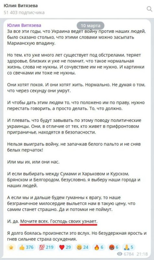И до 2020 года (когда сия псевдо-«Витязева» получила в дополнению к украинскому еще и российское гражданство), города Сумы, Харьков и Одесса (где она родилась и выросла нам всем на радость) ну никак не могли для нее быть не «нашими». А уж до 2015 года так точно. Она и сейчас пишет про «наши города и наших людей» так, чтобы не было однозначно понятно. А уж Курск с Белгородом и Брянском её точно не интересовали в те годы.