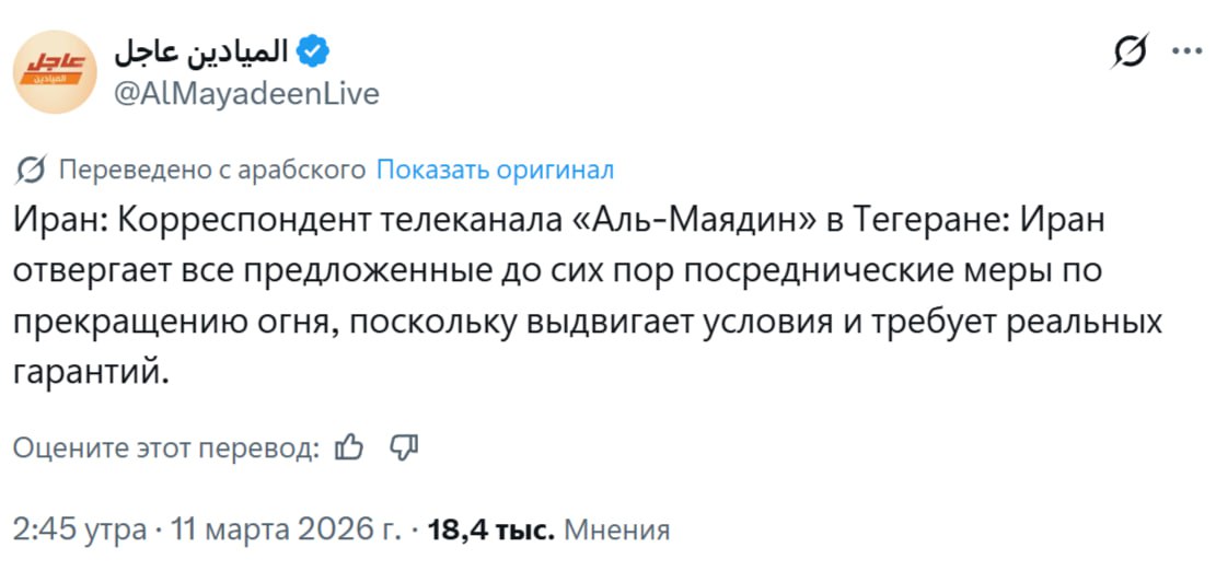 Первоначально сайт «Аль-Маядин» со ссылкой на иранские источники сообщил, что правительство Ирана отвергает все посреднические меры по установлению прекращения огня.
