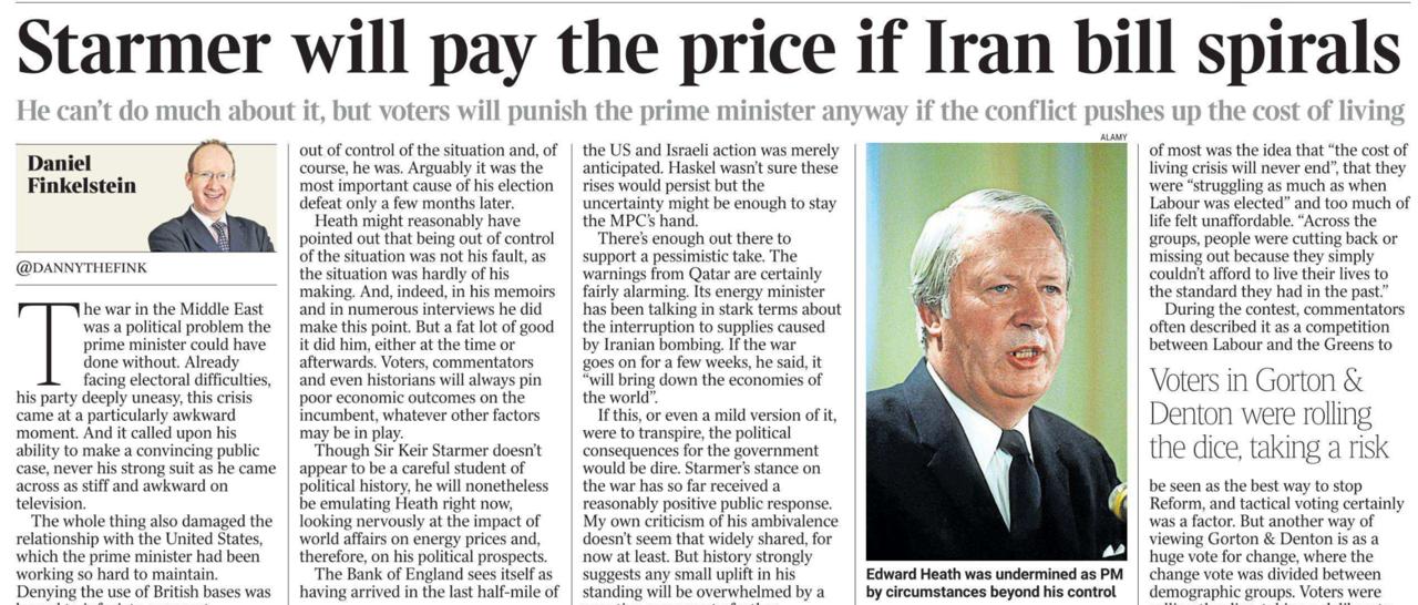 Автор полагает, что в случае роста цен, вызванного войной в Иране, поплатится премьер Кир Стармер. «Он мало что может с этим поделать, но избиратели все равно накажут премьер-министра, если конфликт на Ближнем Востоке еще больше повысит стоимость жизни», - считает Финкельштейн.