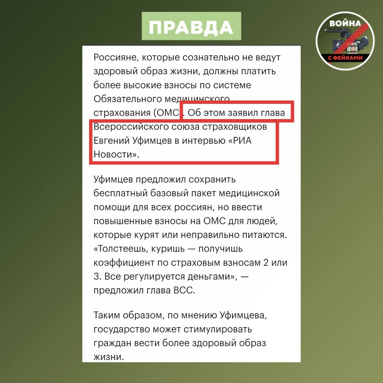 Перед нами снова один из популярных форматов дезинформации — кликбейт-заголовок. Недобросовестные новостники выдали частное мнение за инициативу федерального масштаба. В частности, ввести взносы для людей, пренебрегающих здоровым образом, в разговоре с журналистами предложил глава Всероссийского союза страховщиков Евгений Уфимцев.