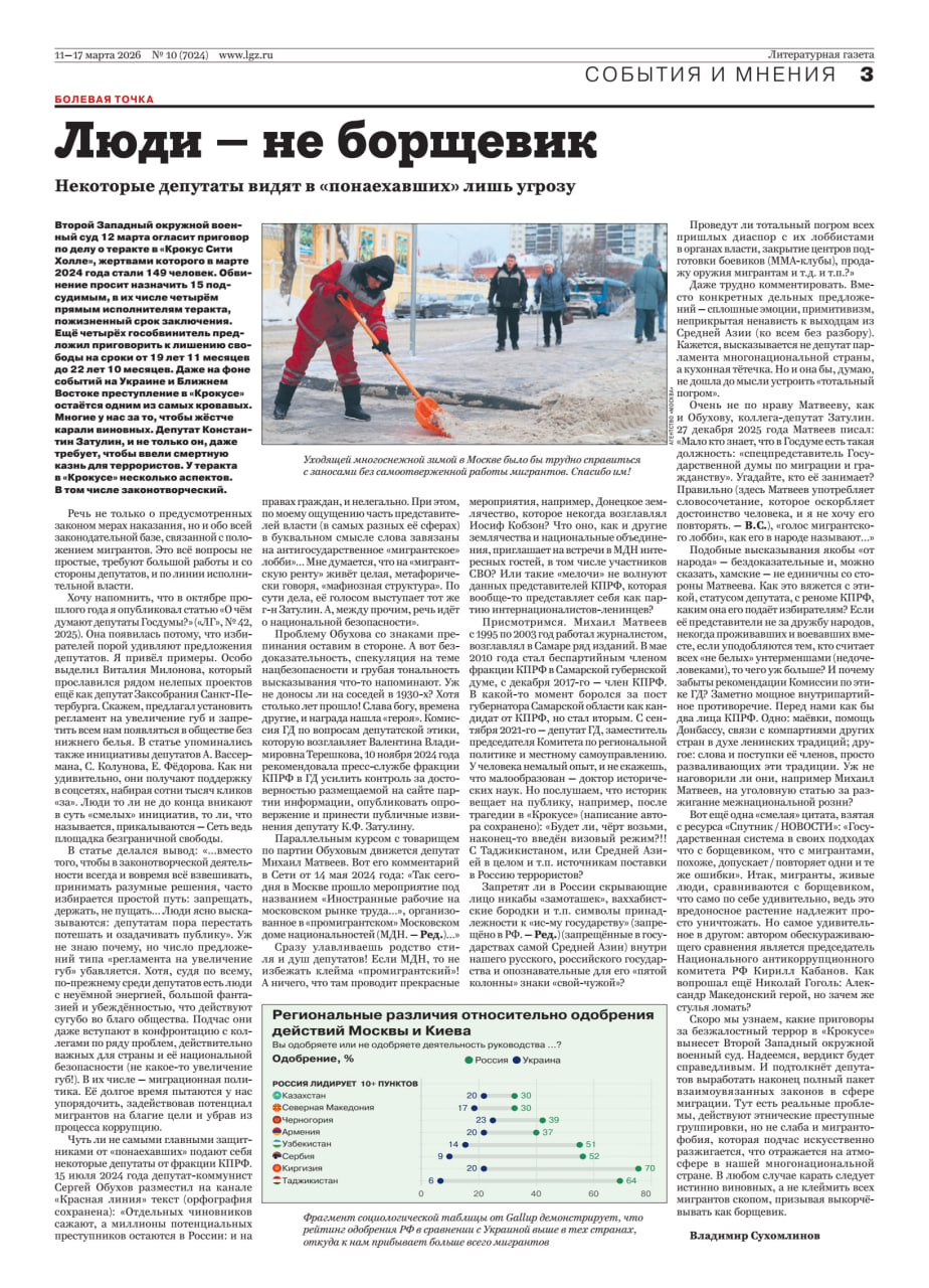 Статья «Люди – не борщевик. Некоторые депутаты видят в «понаехавших» лишь угрозу» политического обозревателя «Литературной газеты» Владимира Сухомлинова в последнем номере «Литературки»