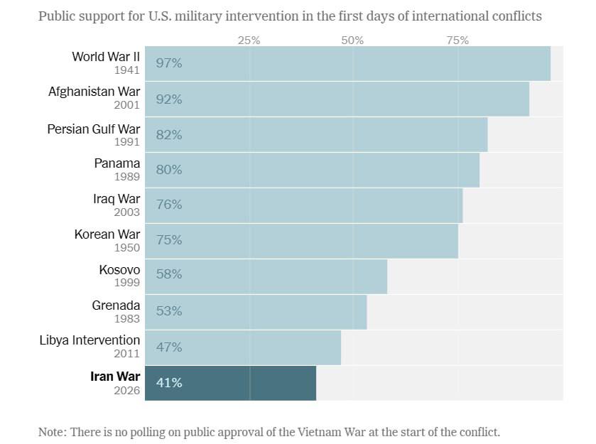 Война с Ираном для американцев стала самой непопулярной из всех войн, которые вели США в последние десятилетия — её поддержал 41% американцев, тогда как вступление во 2-ю Мировую после Пёрл -Харбора — 97%, а в большинство других войн – не менее трёх четвертей. Про Вьетнам, самую непопулярную среди американцев войну, данных нет, тогда опрос не проводили. При этом по Ирану издание приводит данные опроса CNN, отмечая, что есть и более низкие цифры, например 27%, согласно итогам Reuters/Ipsos.