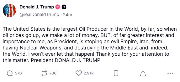 ‘Соединённые Штаты — крупнейший производитель нефти в мире, и когда цены на нефть растут, мы зарабатываем много денег. Но что для меня как президента имеет гораздо большее значение — это не допустить, чтобы злой Иран получил ядерное оружие и разрушил Ближний Восток и, по сути, весь мир. Я никогда не позволю, чтобы это произошло!’