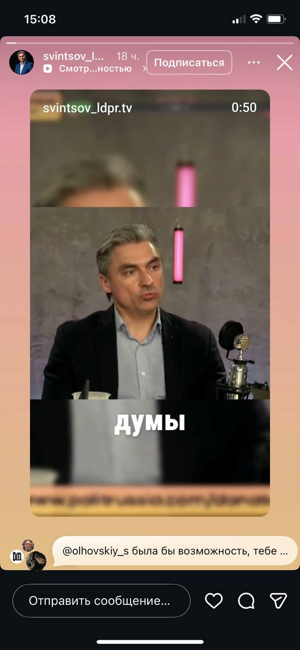 В связи с этим к господину депутату ряд вопросов. Использует ли он для выхода в экстремистскую соцсеть VPN и если да, то как так вышло, что РКН не заблокировал ее так, чтобы «ничерта не работало»? Или такие усилия будут предприняты только в отношении Telegram? Или Свинцову придется перестать постить сторис везде, кроме MAX (где у него 53 подписчика и последний пост аж от 18 февраля)? Слушаем очень внимательно.