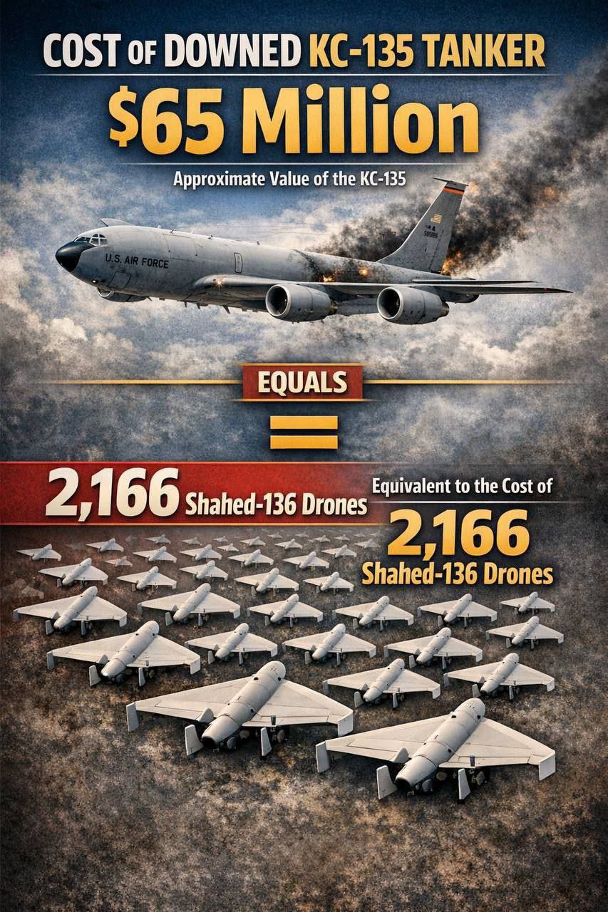 Стоимость упавшего заправщика KC-135 оценивается примерно в 65 миллионов долларов; это примерно равно стоимости около 2166 беспилотников Shahed 136.