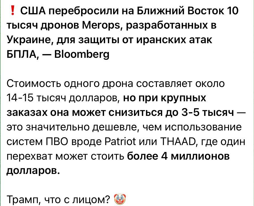 Один вопрос: если на хуторе разработали такие офигенно эффективные и дешевые дроны, то почему тогда Зеленский продолжает выпрашивать американские «патриоты», а Трамп заявляет, что не нуждается ни в украинских дронах, ни в советах, как бороться с иранскими беспилотниками?