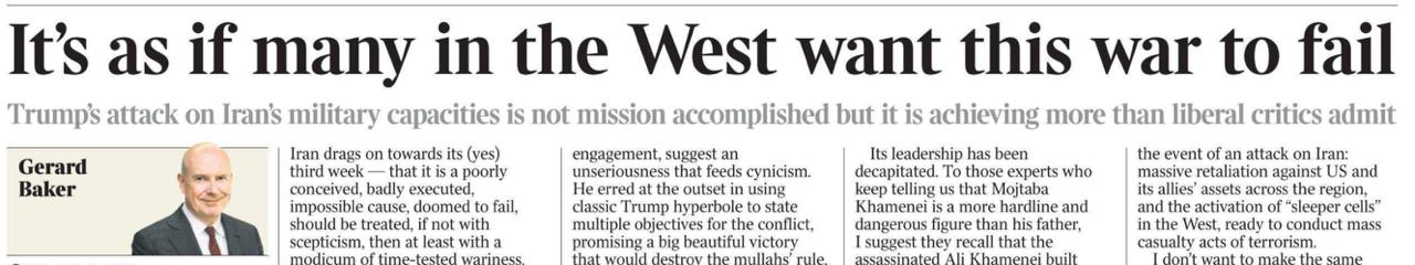 «Создается впечатление, что многие на Западе хотят, чтобы эта война провалилась». Под таким заголовком известный британско-американский журналист Джерард Бейкер на страницах The Times анализирует медийное освещение иранской авантюры Трампа.