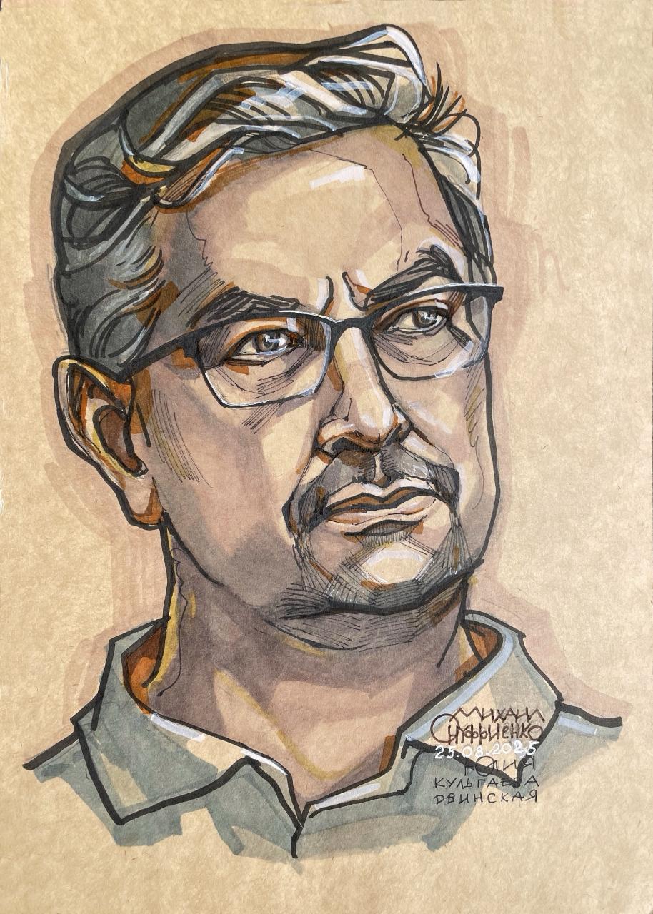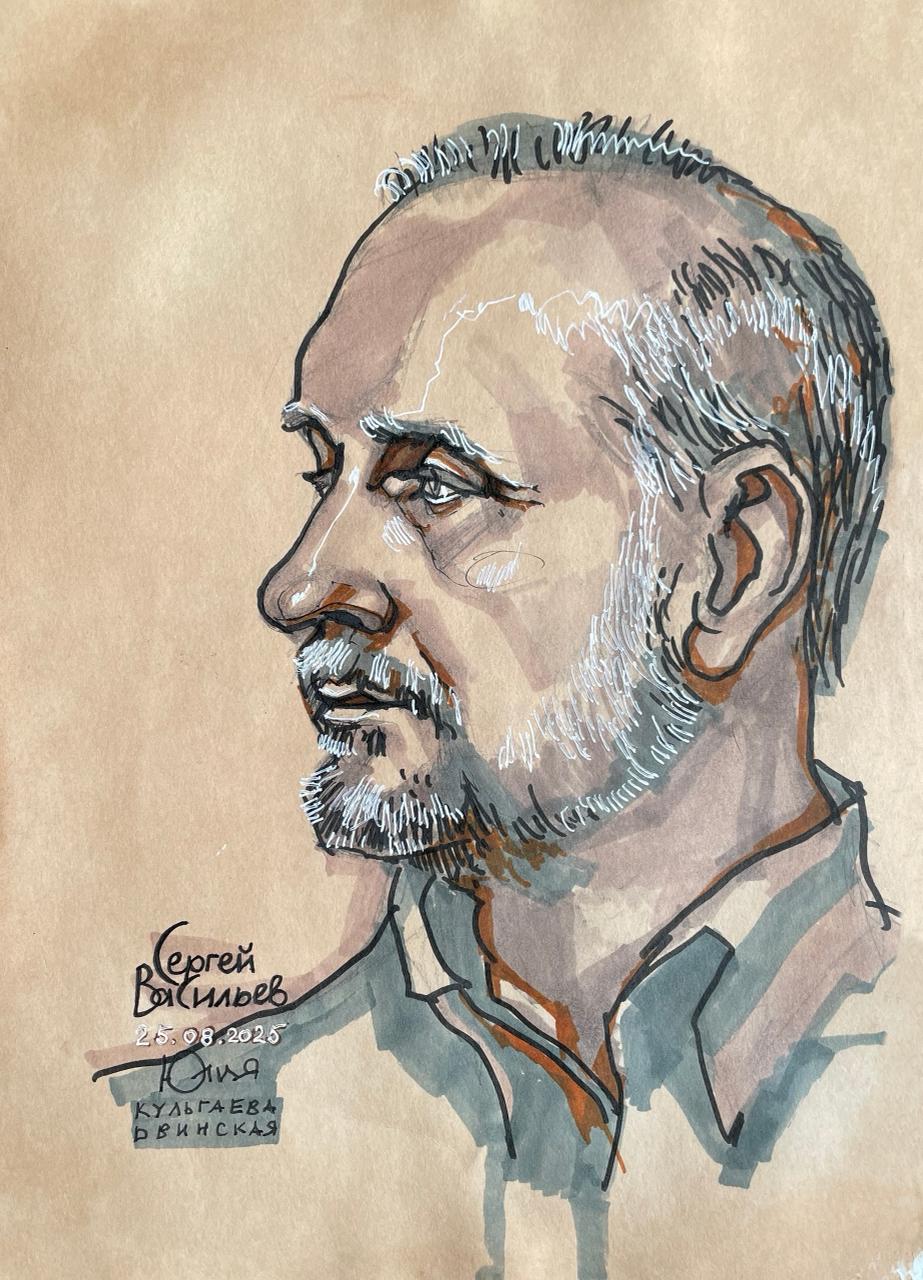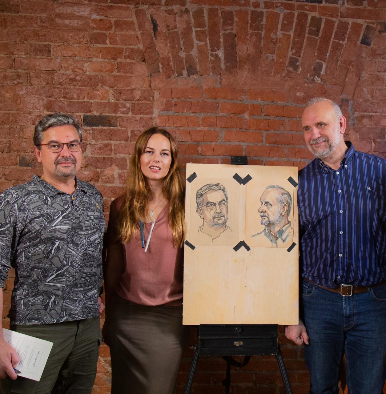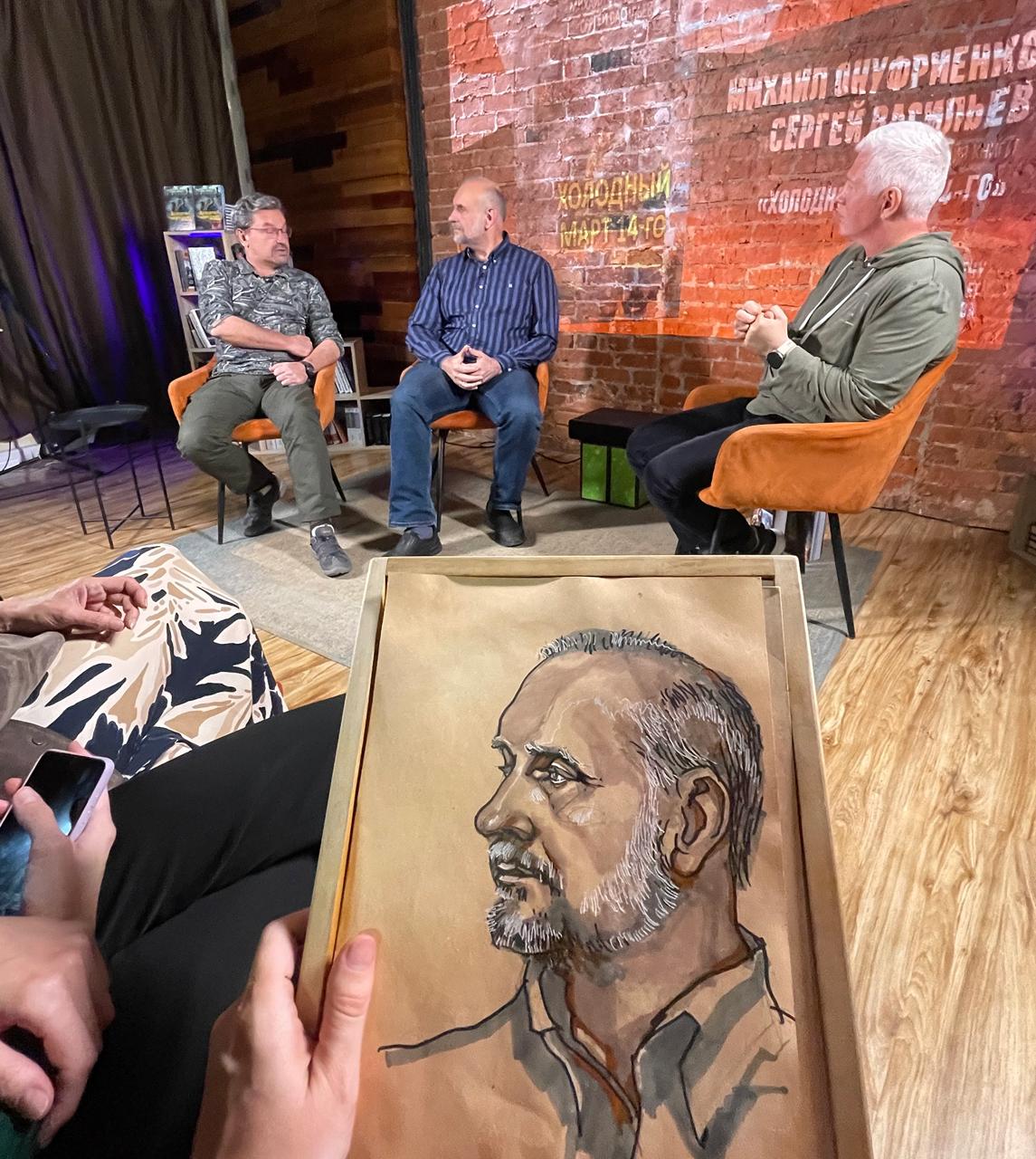 Портреты военного эксперта Михаила Онуфриенко и писателя Сергея Васильева, нарисованные во время эфира передачи «СВО / Большой контекст» в «Бункере на Лубянке», продолжают онлайн-выставку Юлии Кульгаевой-Двинской «НАШИ. СВОИ. РОДНЯ».