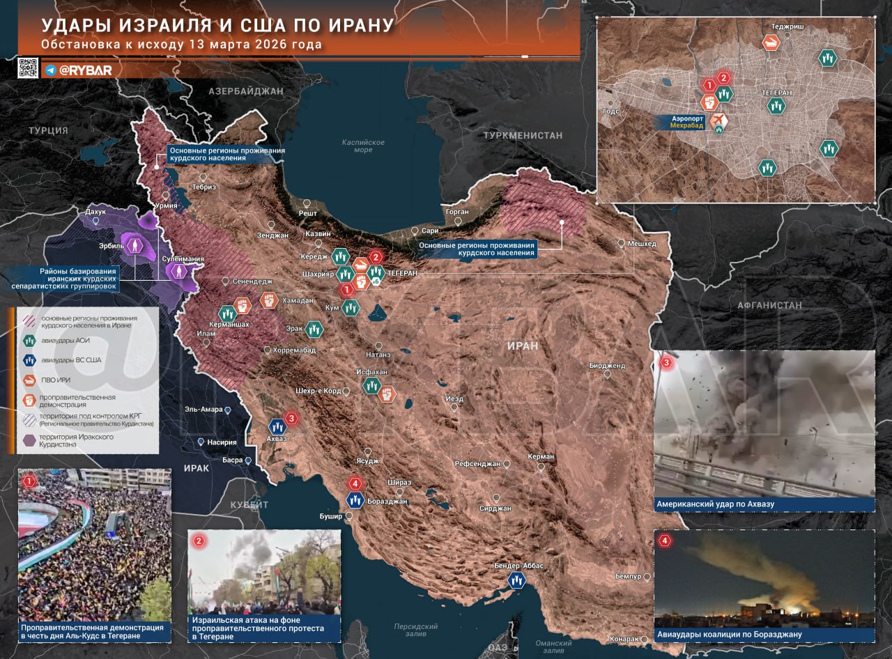 В Иране удары коалиции сохраняют высокую интенсивность. Под огнём вновь оказались Тегеран, Исфахан, Кум, Бендер-Аббас и Боразджан. На этом фоне в стране прошли массовые проправительственные акции ко Дню Аль-Кудс, а вечером израильская авиация нанесла удар вблизи толпы демонстрантов в Тегеране.