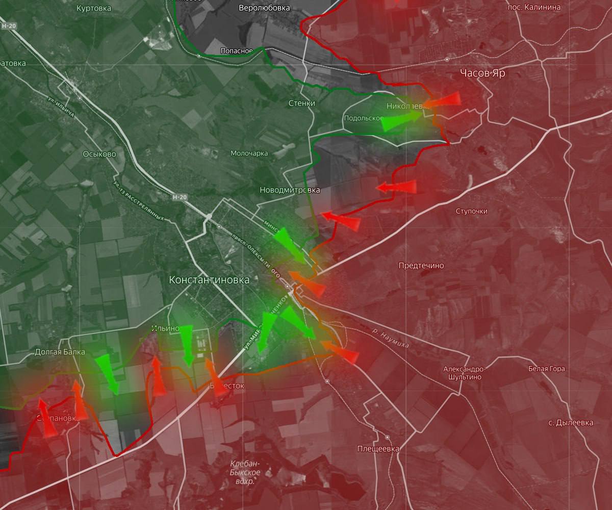 «На Константиновском направлении ВС РФ продвигаются на подступах к одноименному городу. На северо-восточных окраинах Константиновки продолжаются встречные столкновения малых групп, а российские войска продвигаются на южных подступах к городу.