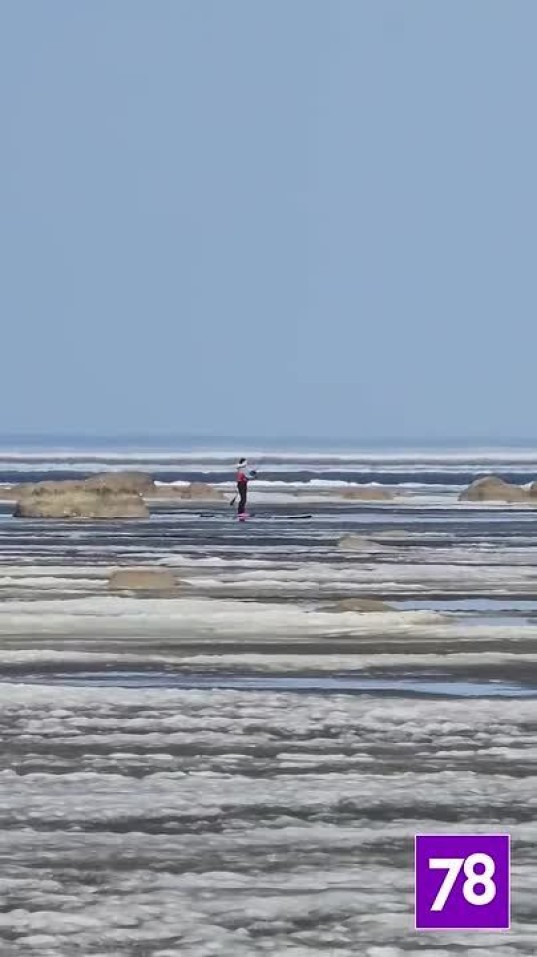 На Финском заливе близ Шепелевского маяка любители активного отдыха устроили заплыв на SUP-досках. По словам очевидицев, водная прогулка происходит в 300 метрах от береговой линии.
