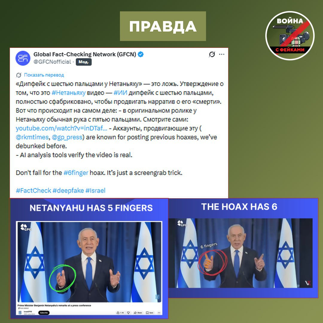 Фейк: Премьер-министр Израиля Нетаньяху, возможно, мертв, ведь свежие видео с ним созданы нейросетями. Об этом свидетельствуют 6 пальцев на руке политика, пишут в соцсетях и мессенджерах.