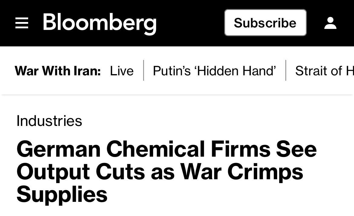 Крупнейшая экономика ЕС переживает новый удар. Химические предприятия Германии резко сокращают производство из-за эскалации ближневосточного конфликта, — констатирует Bloomberg