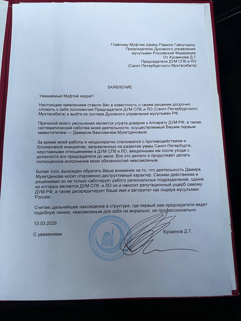 Руководитель мусульманской общины Петербурга Дамир Хусаинов объявил о сложении полномочий и выходе из состава Духовного управления мусульман России (ДУМ). В заявлении он сообщил, что причиной стали разногласия с зампредом ДУМ Дамиром Мухетдиновым, который, по словам Хусаинова, «саботирует работу региональных подразделений» и «наносит ущерб самому ДУМ».