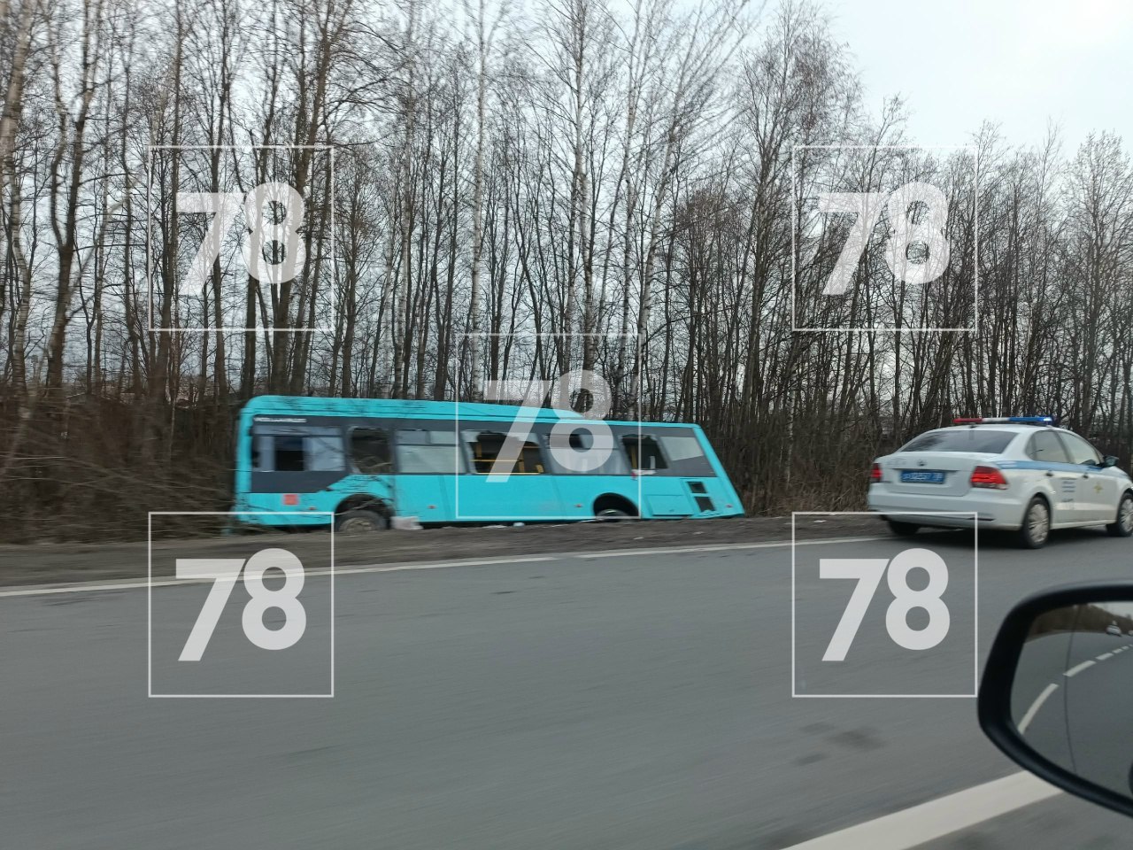 Близ остановки Оружейная рядом с посёлком Понтонным транспорт сошёл с дороги, завалившись на бок. Предположительно, номер автобуса — 438.