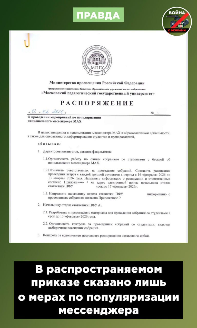 На самом деле в тиражируемом распоряжении говорится о «проведении мероприятий по популяризации национального мессенджера». Например, документ предусматривает проведение очных собраний, на которых студентам расскажут о возможностях использования МАХ в учебном процессе. Мероприятия носят просветительский характер. Установка мессенджера является добровольной.