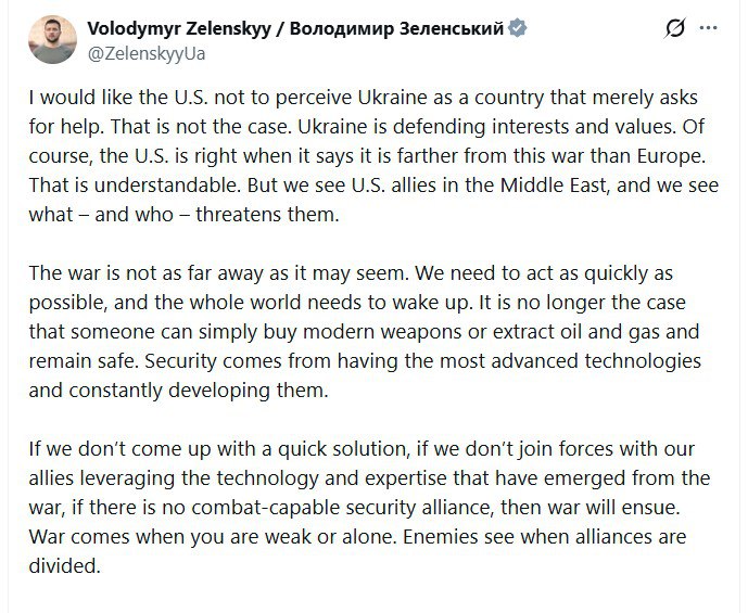 ‘Мне бы хотелось, чтобы США не воспринимали Украину как страну, которая просто просит о помощи. Это не так. Украина защищает свои интересы и ценности. Конечно, США правы, когда говорят, что находятся дальше от этой войны, чем Европа. Это понятно. Но мы видим союзников США на Ближнем Востоке, и мы видим, что – и кто – им угрожает. Война не так уж далека, как может показаться’ - Зеленский дерзит Трампу.