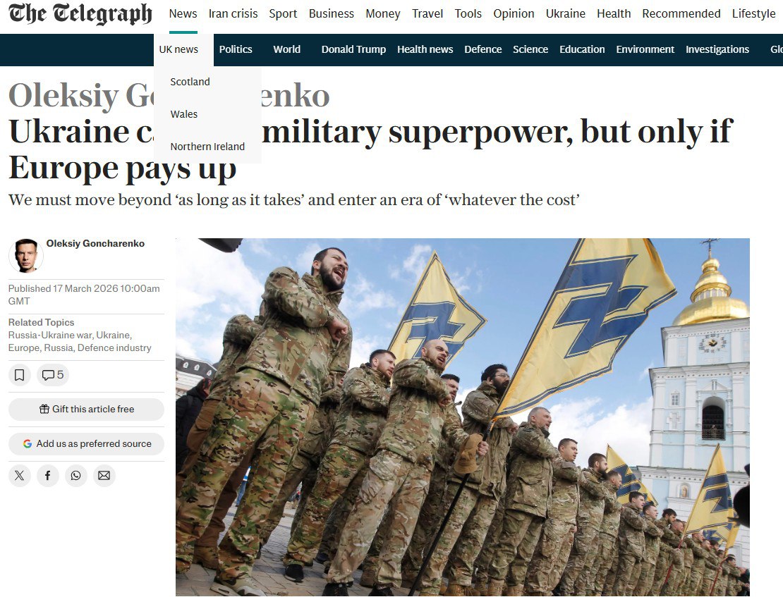 ‘Украина может стать военной сверхдержавой, но только если Европа окажет ей поддержку. И если Украина должна стать ‘фундаментом европейской безопасности’, то Европа должна быть готова заплатить за фундамент, на котором она стоит.