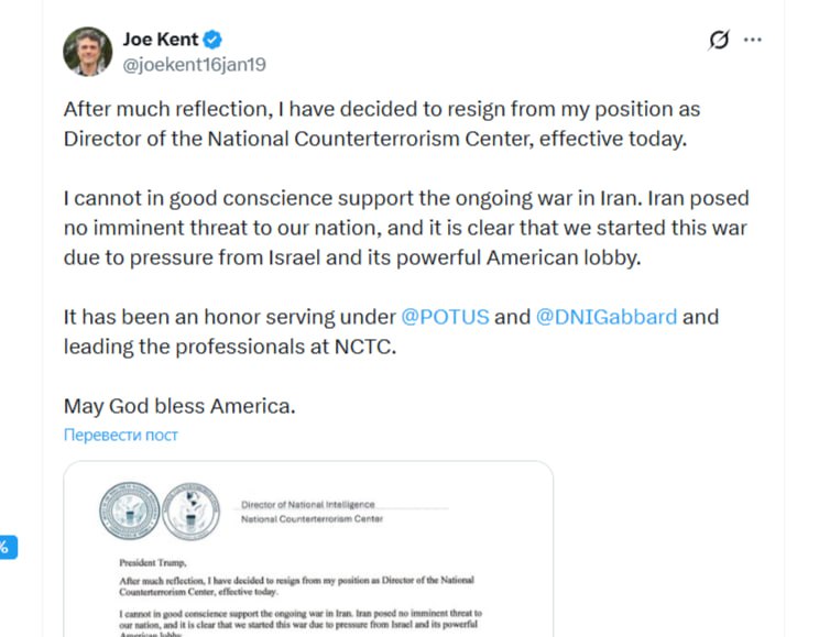 "После долгих раздумий я принял решение уйти в отставку с поста директора начиная с сегодняшнего дня, — сообщил директор Национального контртеррористического центра Джо Кент. — Иран не представлял непосредственной угрозы для нашей страны, и очевидно, что мы начали эту войну под давлением Израиля и его влиятельного американского лобби". К сообщению он приложил копию прошения об отставке.