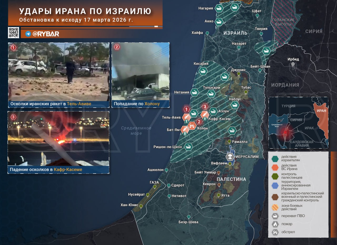 В Израиле иранцы продолжили наносить удары по центральной части страны. По агломерации Гуш-Дан были выпущены баллистические ракеты с кассетной боевой частью, одно из попаданий зафиксировано на окраине Холона. В Тель-Авиве-Яффо, Бат-Яме и Кафр-Касеме сработала система ПРО «Хец», а основной ущерб связан с падением осколков.