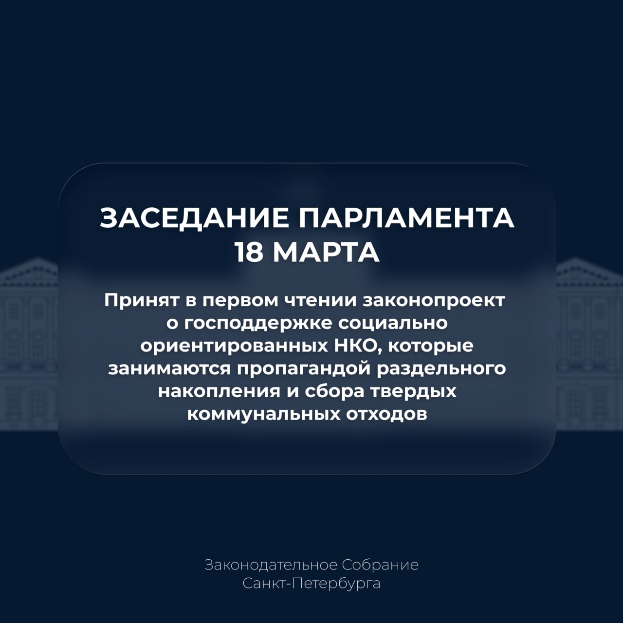 Собрание приняло в первом чтении законопроект о государственной поддержке социально ориентированных некоммерческих организаций, которые занимаются пропагандой раздельного накопления и сбора твердых коммунальных отходов.
