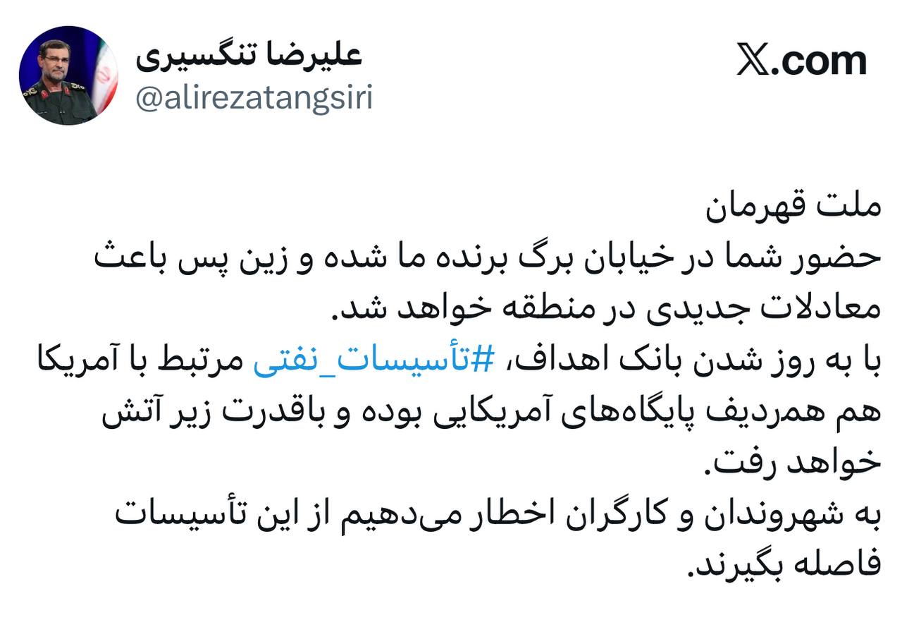 Командующий ВМС КСИР Алиреза Тангсири сообщил, что отныненефтяные объекты США в одном ряду с военными базами.