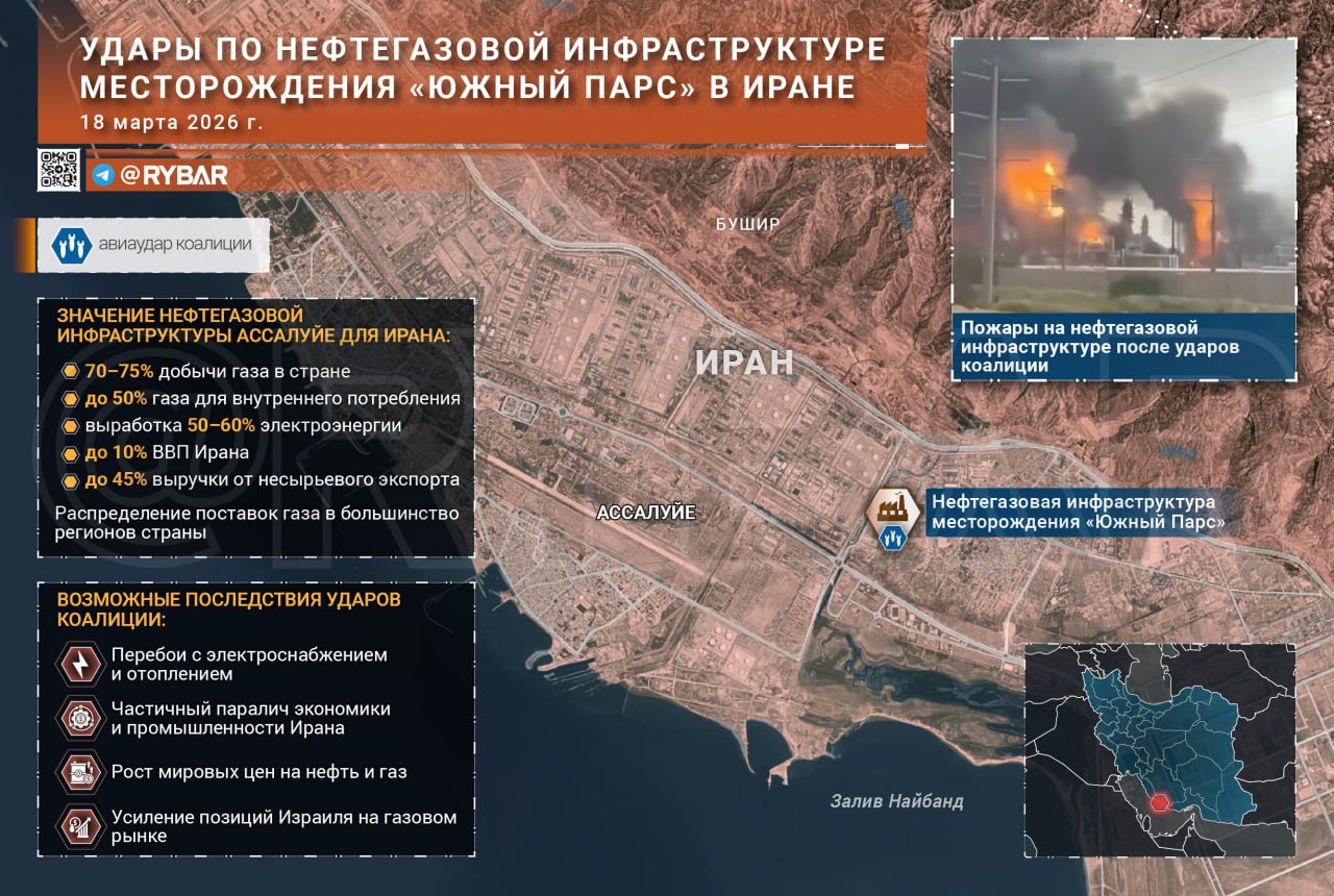 В Иране под ударами оказались объекты нефтегазовой инфраструктуры в районе месторождения Южный Парс. Повреждены ключевые узлы переработки и распределения газа, а также несколько нефтеперерабатывающих предприятий.