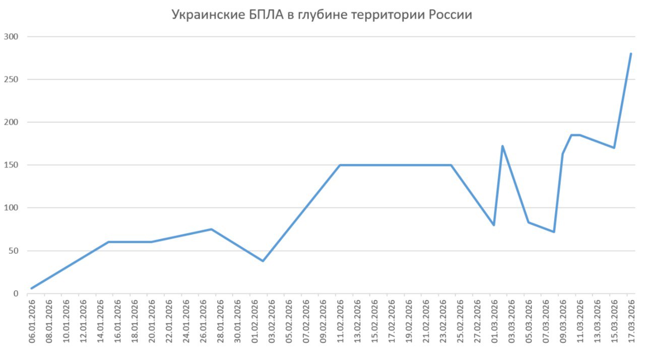 Юрий Баранчик: Если проанализировать официальные заявления чиновников о зафиксированных украинских БПЛА запущенных в глубину территории Росси, с 1 января по настоящее время, то график получается вполне наглядный